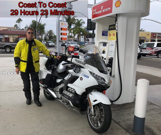 On September 30, 2018 I completed a ride coast to coast in 29 hours and 23 minutes. I started near Dog Beach in San Diego and finished the ride at Jacksonville Beach. I started the ride at 7:22 AM east coast time and arrived in Jacksonville Beach at the finish at 12:45 PM. The ride was 2,370 miles. Click here for more information on this ride.